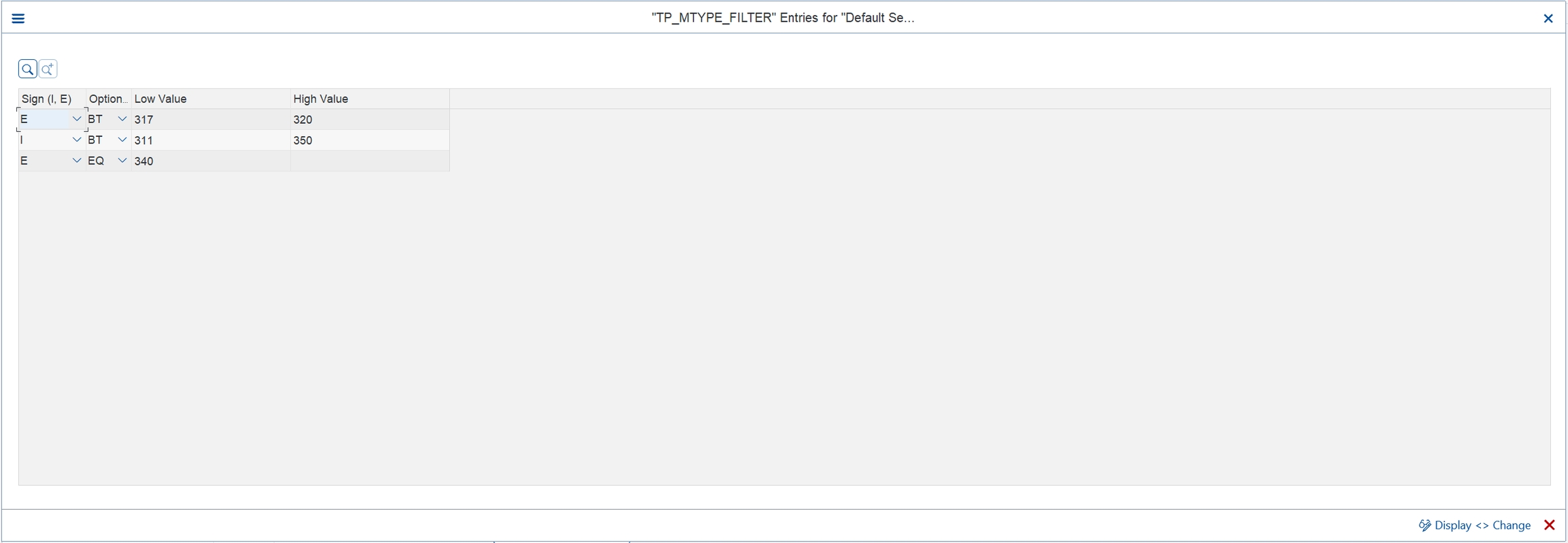 INCLUDE is entered into the app master data with the ‘Sign’ as ‘I’ and EXCLUDE is entered with ‘E’.