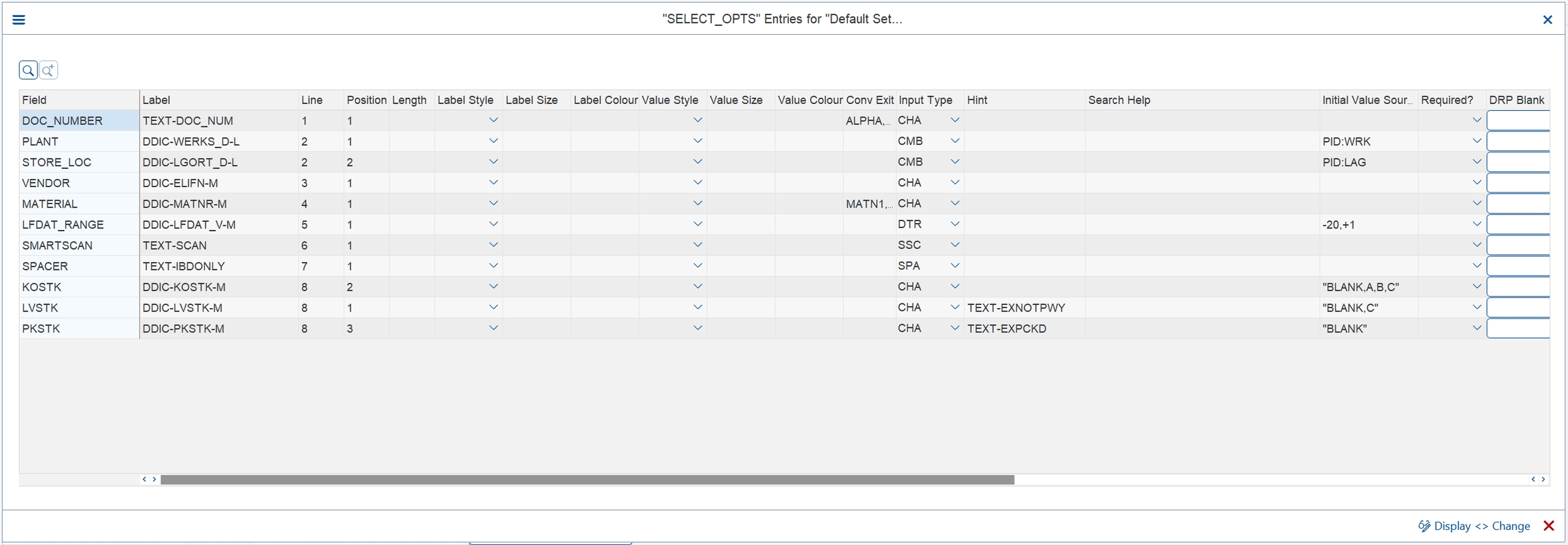 This is usually denoted with an ‘X’, however a different character can be added to show this field is grouped with other fields having the same character. For example, if material and batch are both maintained with an ‘A’, at least one of the fields (but not necessarily both) must be entered. If material and batch are both maintained with an ‘A’ and plant with a ‘B’, then at least one of the material or batch fields (but not necessarily both) must be entered and plant must also be entered.