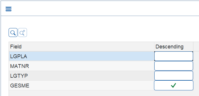 The below screen shows a WM stock enquiry list, to be sorted by bin (ascending), material (ascending), storage type (ascending) and quantity (descending).
