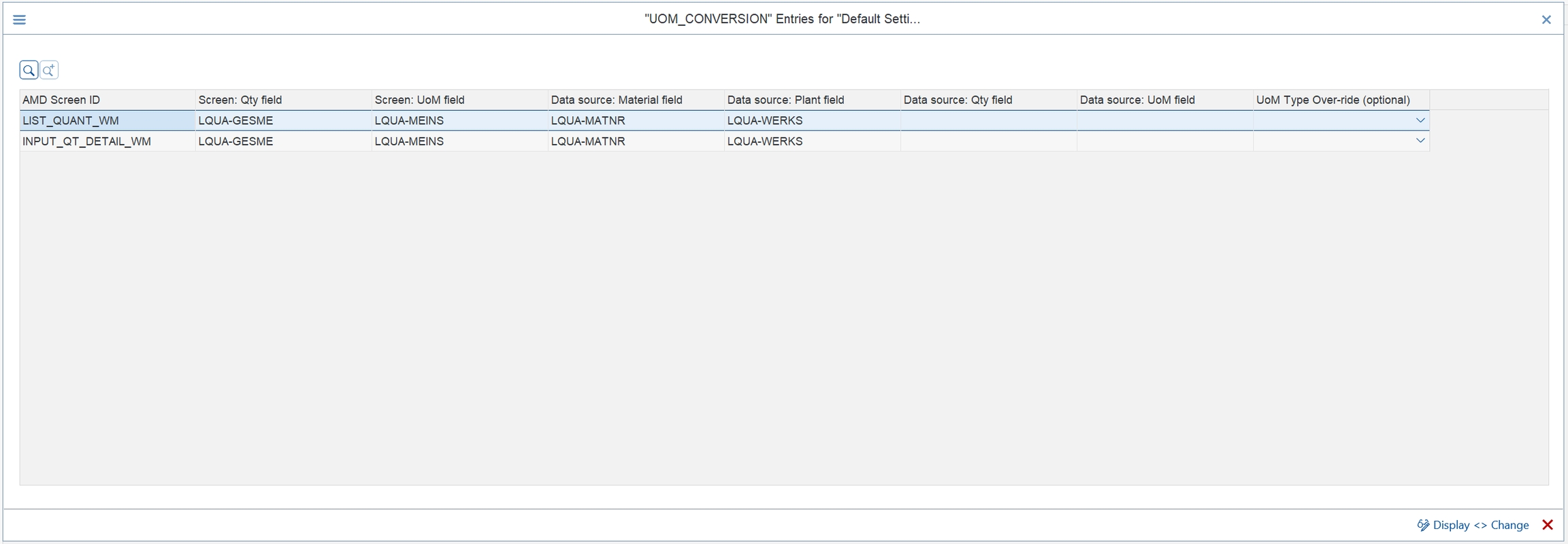 If a specific app transaction requires the quantity to be converted to an alternative UoM then the UoM Conversion AMD element needs to be maintained. This is done for each specific screen required and includes the specific fields for both 'Quantity' and 'UoM' that need to be displayed with the converted data.