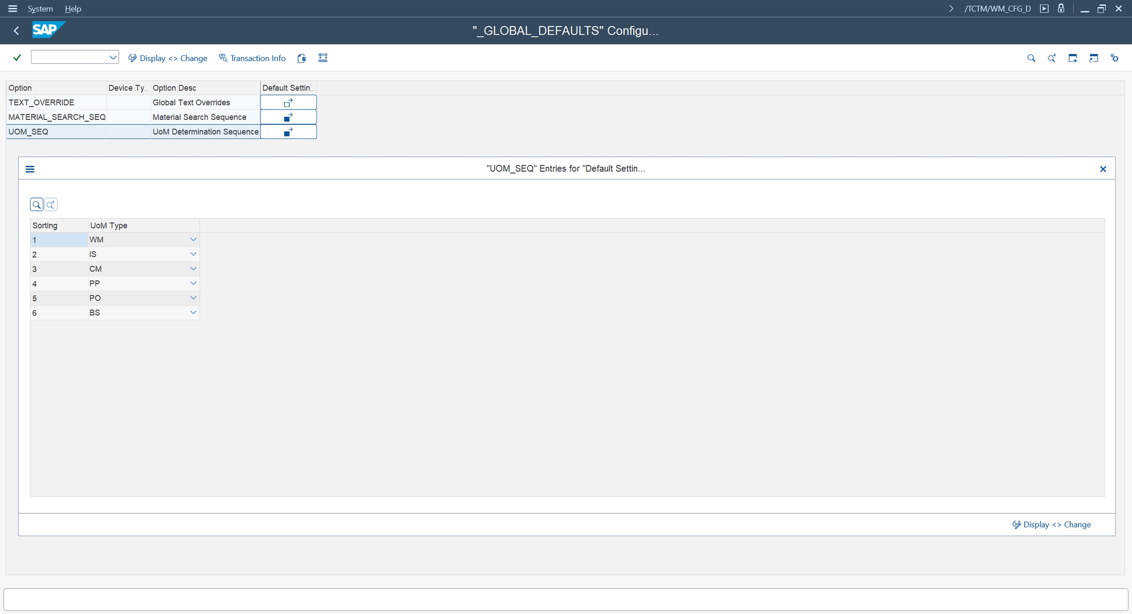 A global UoM sequence can be maintained in AMD for the app transaction _GLOBAL_DEFAULTS. The configuration element "UOM_SEQ" allows you to define a sequence of UoM types (e.g., WM unit, Issue unit, Planning unit, Base unit).
