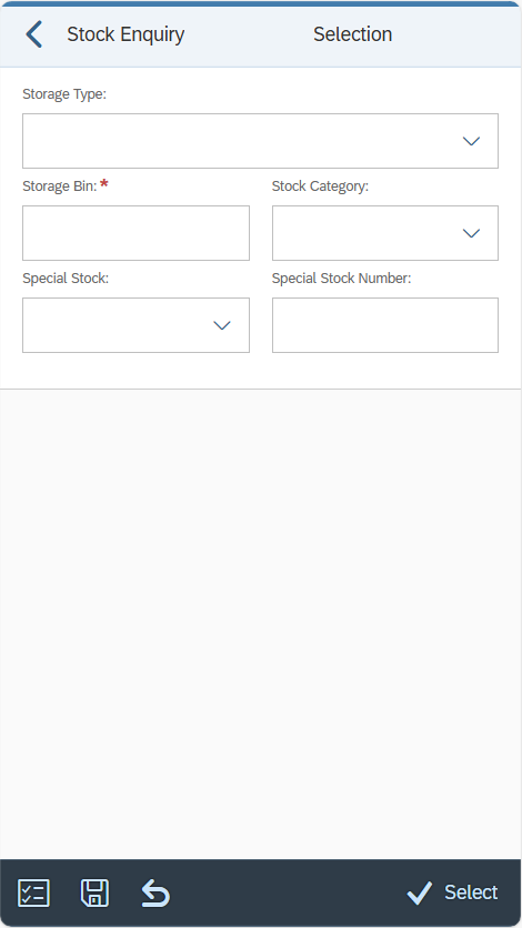 A selection screen is usually the first screen in the app when a selection of appropriate data is required before processing can begin, such as the selection of stock in the warehouse via stock enquiry by material.