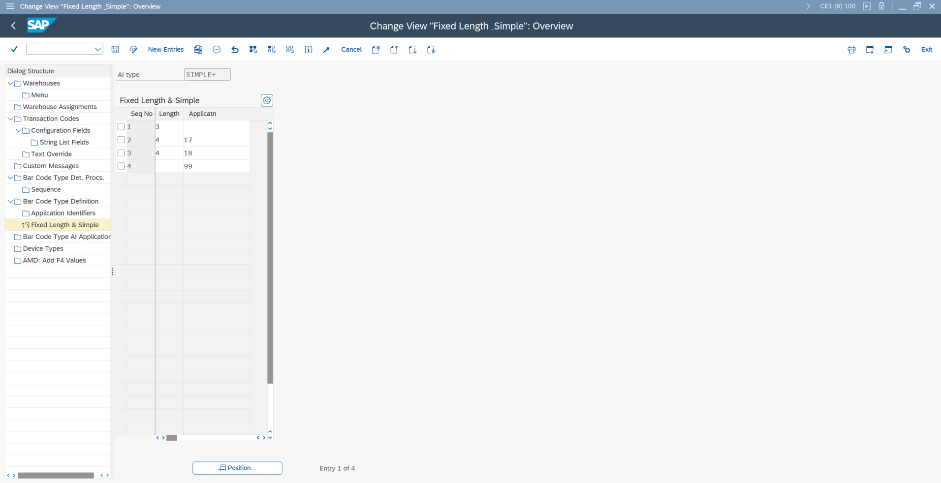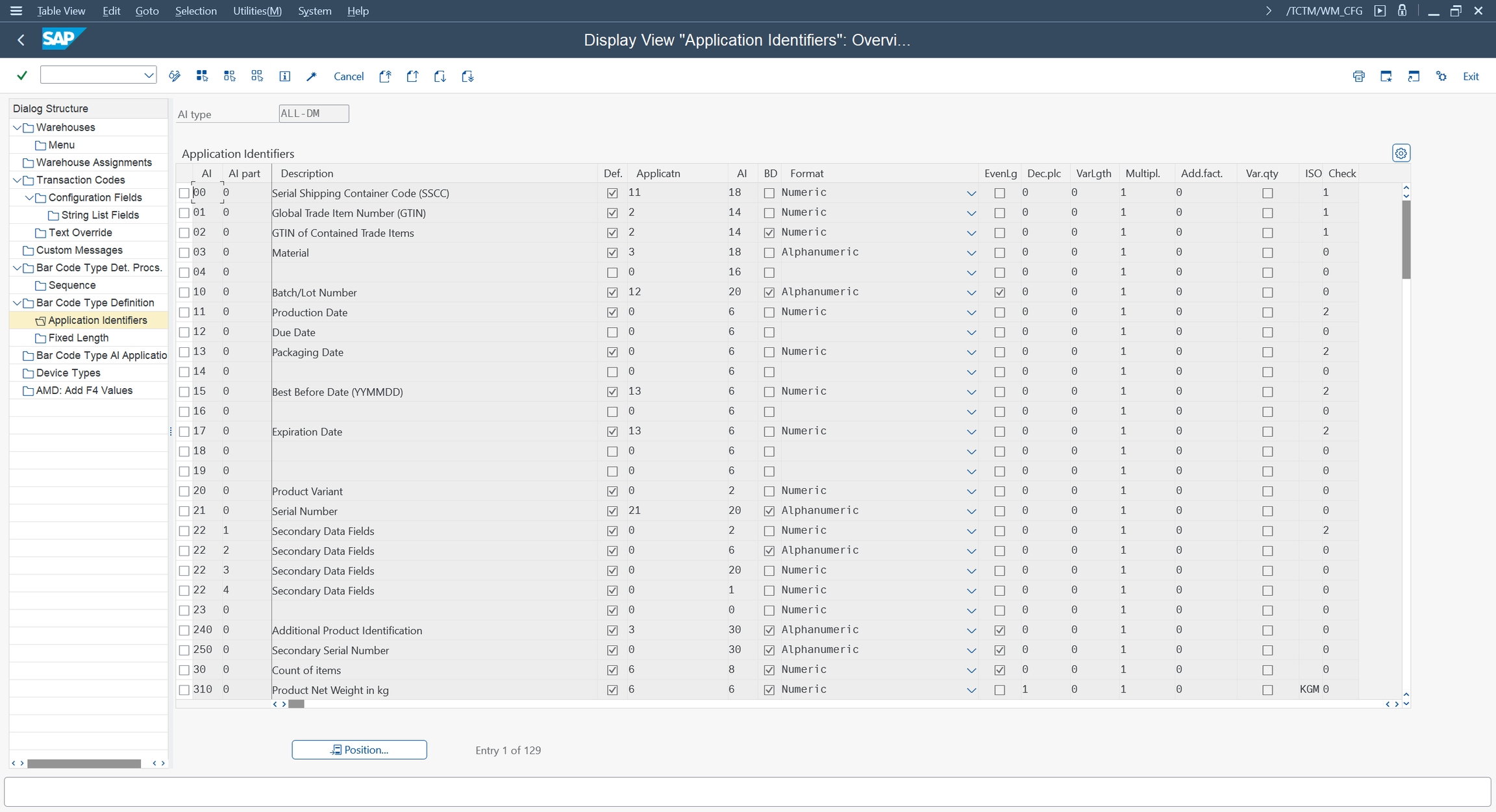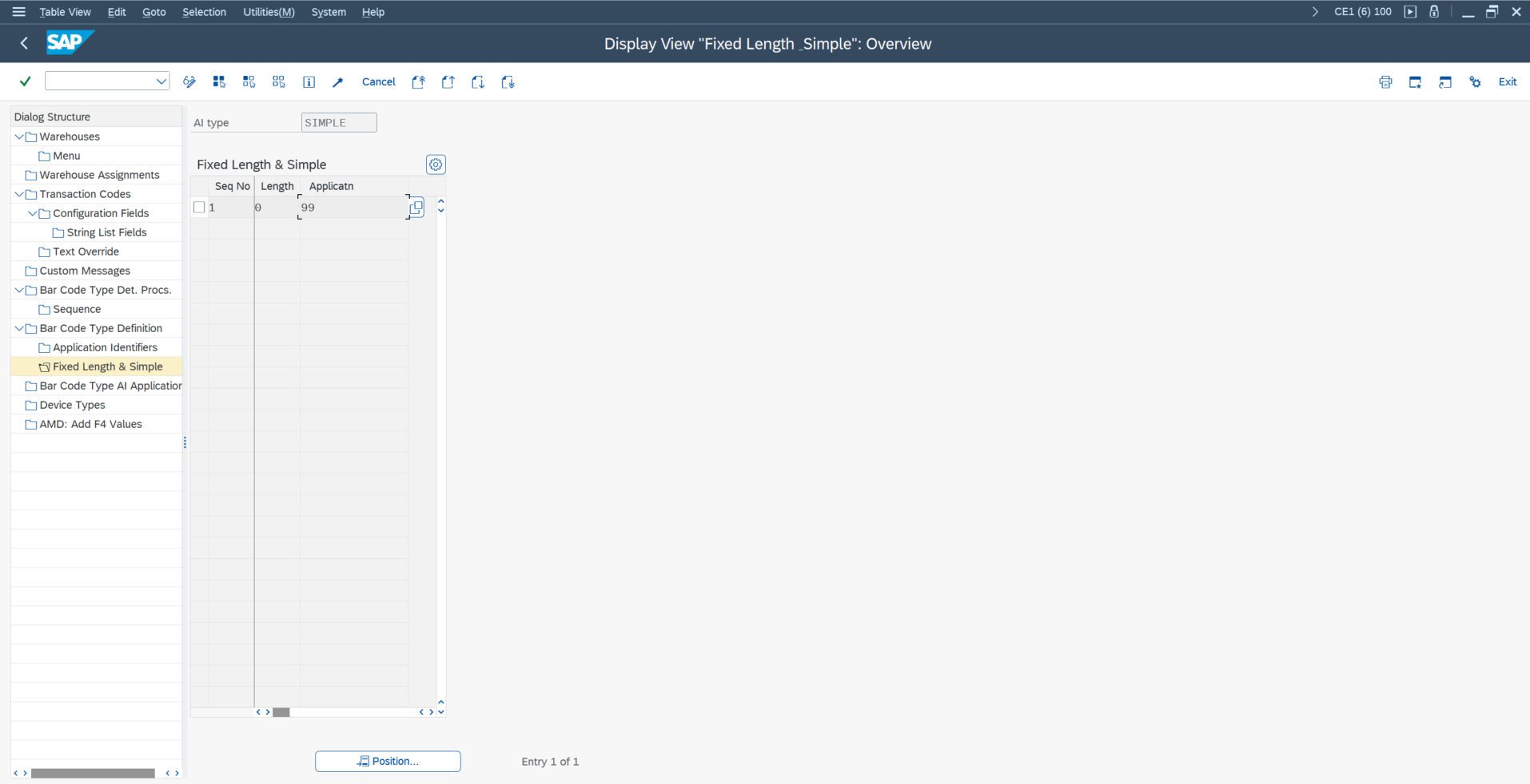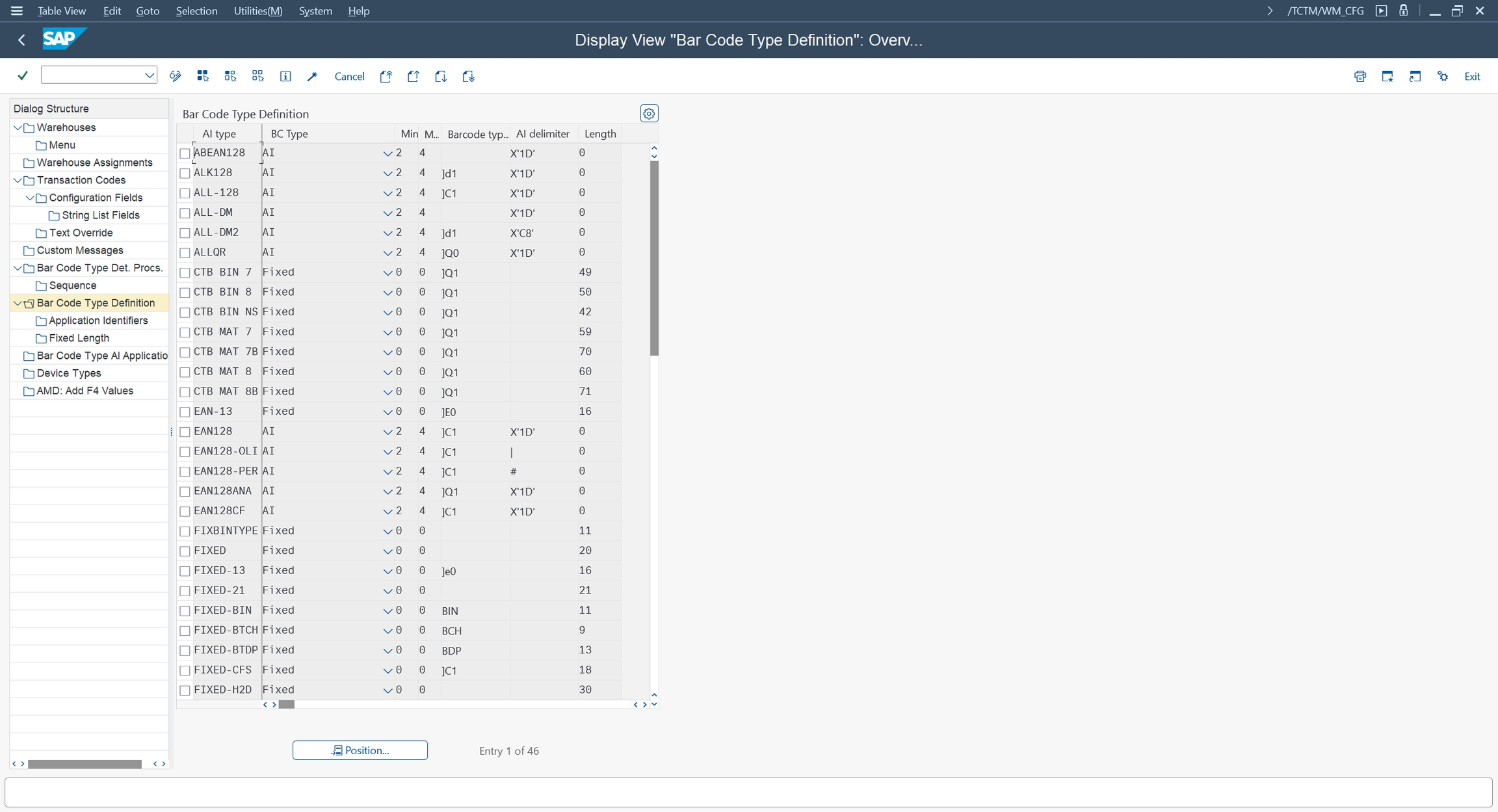 As per standard SAP, a barcode type definition can be set up in line with GS1 standards as show in the example ‘EAN128’ below.