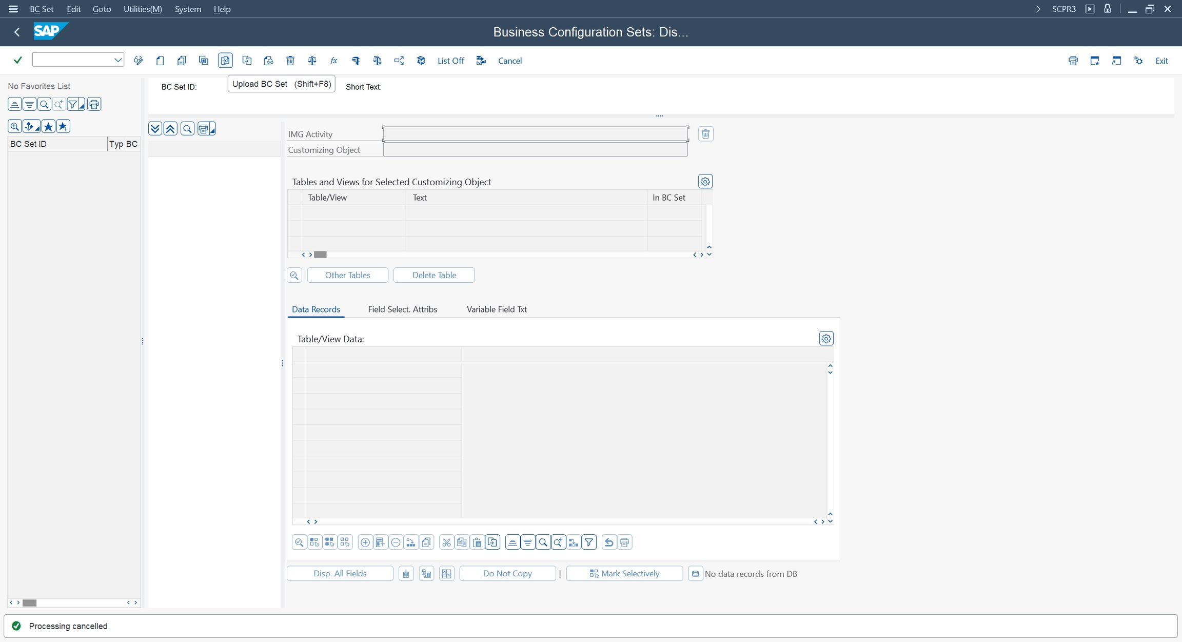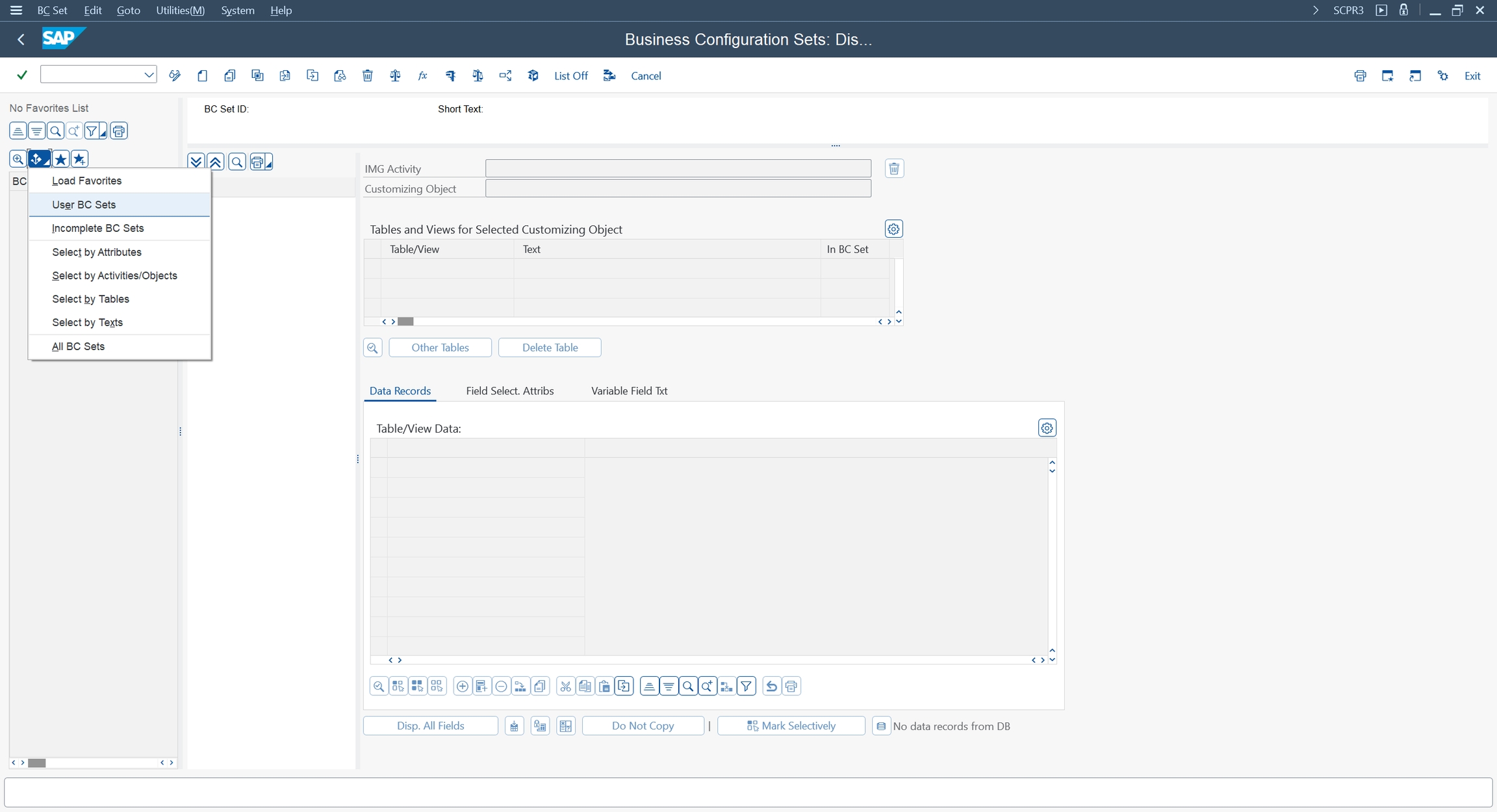 Go to transaction SCPR3 and load the BC sets that were previously created by selecting the ‘User BC Sets’ option under the ‘New BC Set Selection’ icon.