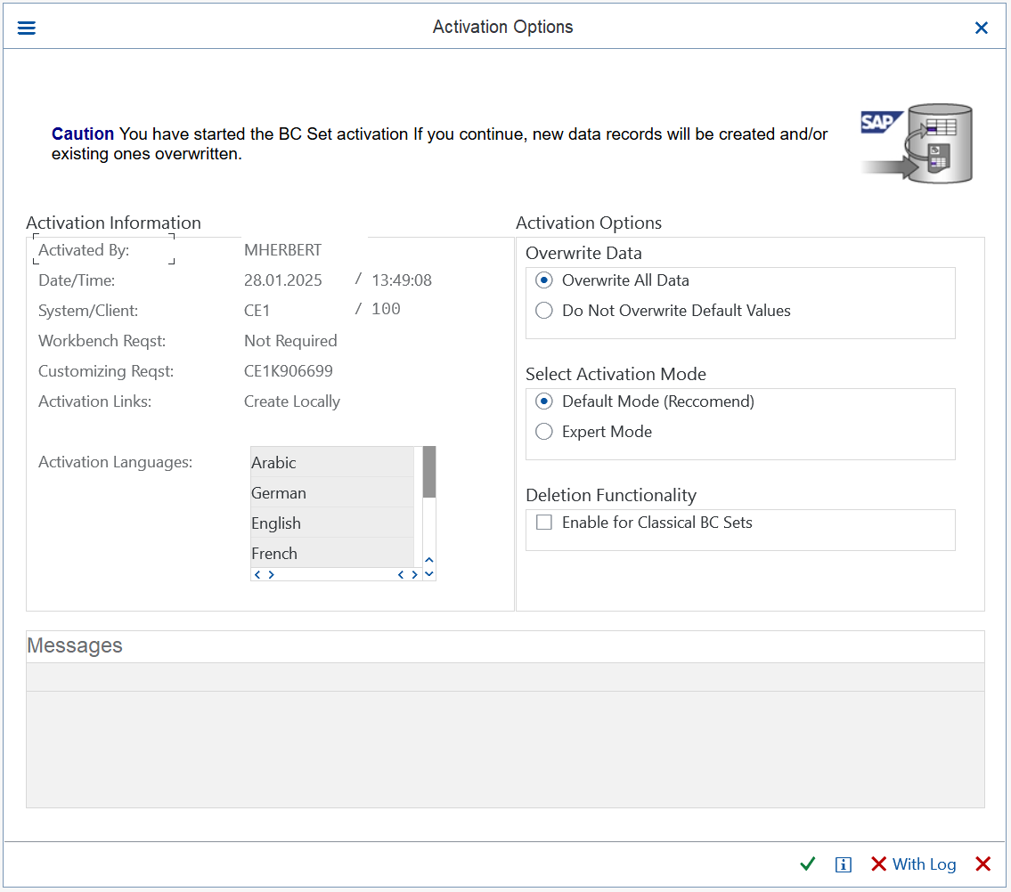 On the following pop-up, if the SAP system is a Unicode system then leave the Activation Mode as ‘Default Mode’. If it isn’t Unicode, then change the Activation Mode to ‘Expert Mode’. This will ensure that all the sequence numbers of the configuration fields are loaded as determined in the BC set.