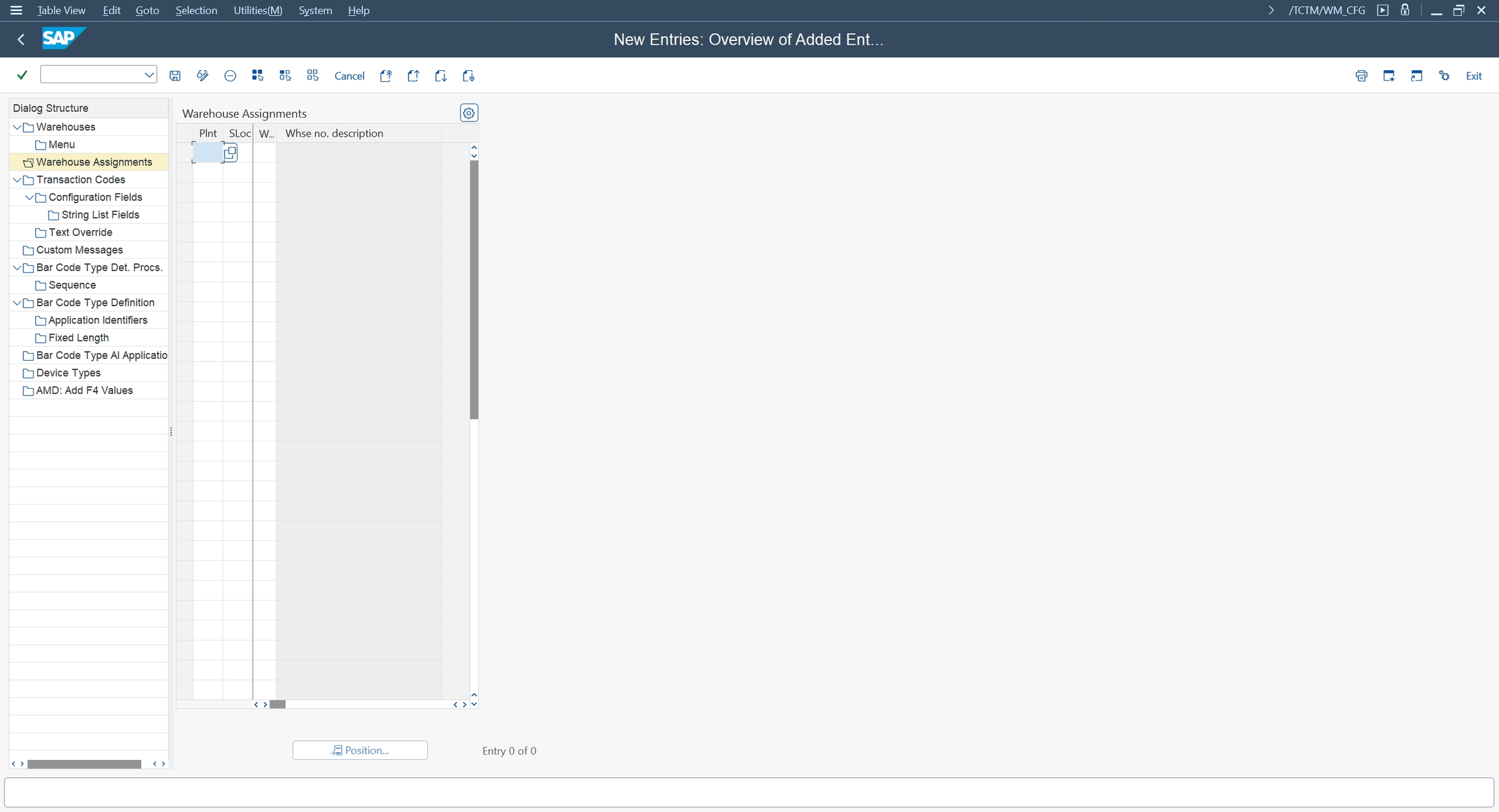 Select 'Warehouse Assignments' from the Dialog Structure on the left of the screen and add the required plant, storage location and warehouse. Click 'Save' when all the assignments have been added to save your changes.