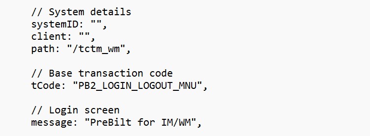 The PreBilt transaction to be used for the login should also be updated from the supplied "PB2_LOGIN_LOGOUT_MNU" to the proposed client transaction - typically the "PB2" prefix is replaced with a client specific code. See the page for Transaction codes in the Configuration Guide section.